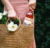 Photographed by San Diego food and drink photographer Amy Carson. Commercial lifestyle advertisement of a woman holding a woven bag with bottle of Lillet rose wine and flowers in a lush garden setting.